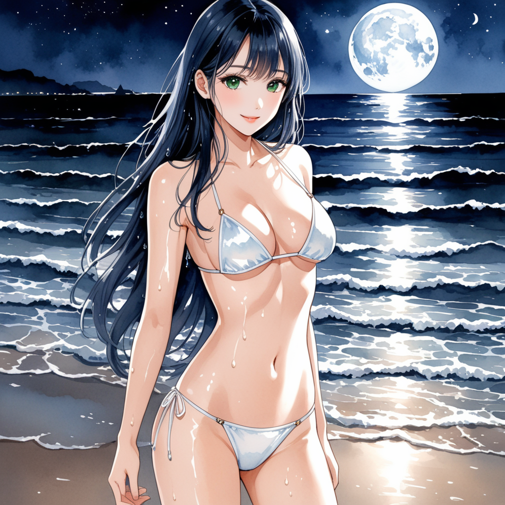 ultra-detailed, best quality, (anime drawing:1.2), (watercolor painting:0.91), detailed anatony, detailed face, detailed body, detailed shadow, detailed lip, detailed fingers, super-detailed white micro bikini, perfect body, perfect green eyes, perfect eyeliner, perfect eyelashes, aesthetic, beauty, beautiful, pretty, ㅅㅅy, cute, lovely, sweet, female, solo, dark blue hair, Parted to Side bangs, long hair, green eyes, mesmerizing eyes, (closed eyes:0.98), eyeliner, eyelashes, (blush:1.3), (open mouth:1.3), (smile:1.4), (seduced face:1.2), (large breasts, large tit, large chest:1.6), Slender, slim body, belly, small waist, wide pelvis, (white micro bikini, mini bikini, tiny bikini:1.75), pale skin, lustrous skin, shiny skin, (wet:1.1), perspective, looking at viewer, full body, from front, nights, midnight, dark Beach, shore, sea, tide, full moon,