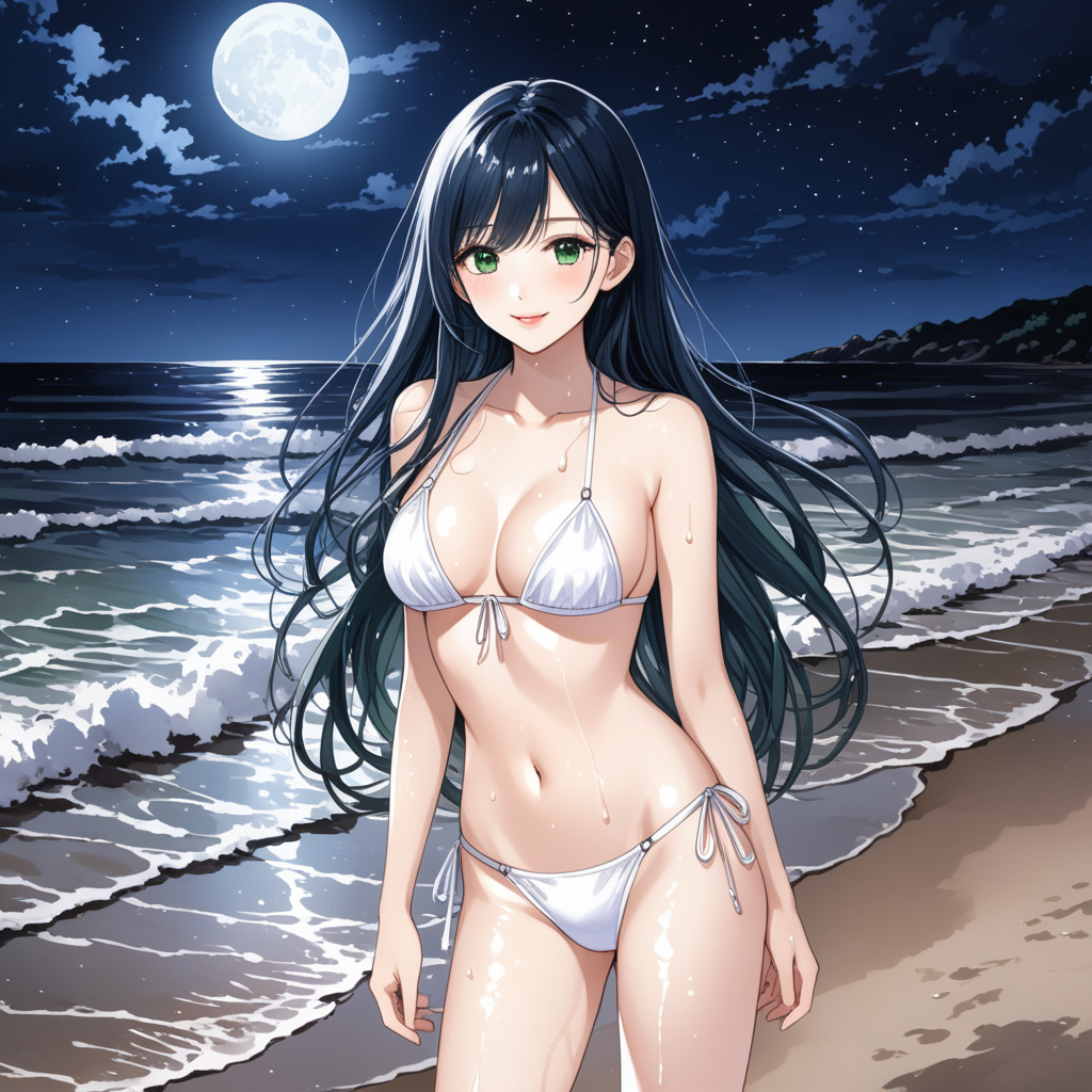 ultra-detailed, best quality, (anime drawing:1.2), (watercolor painting:0.91), detailed anatony, detailed face, detailed body, detailed shadow, detailed lip, detailed fingers, super-detailed white micro bikini, perfect body, perfect green eyes, perfect eyeliner, perfect eyelashes, aesthetic, beauty, beautiful, pretty, ㅅㅅy, cute, lovely, sweet, female, solo, dark blue hair, Parted to Side bangs, long hair, green eyes, mesmerizing eyes, (closed eyes:0.98), eyeliner, eyelashes, (blush:1.3), (open mouth:1.3), (smile:1.4), (seduced face:1.2), (large breasts, large tit, large chest:1.6), Slender, slim body, belly, small waist, wide pelvis, (white micro bikini, mini bikini, tiny bikini:1.75), pale skin, lustrous skin, shiny skin, (wet:1.1), perspective, looking at viewer, full body, from front, nights, midnight, dark Beach, shore, sea, tide, full moon,