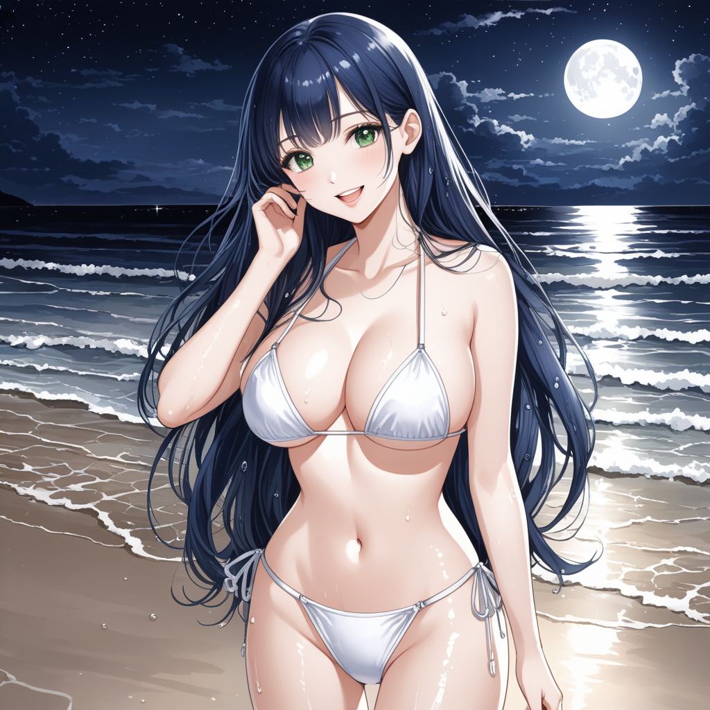 ultra-detailed, best quality, (anime drawing:1.2), (watercolor painting:0.91), detailed anatony, detailed face, detailed body, detailed shadow, detailed lip, detailed fingers, super-detailed white micro bikini, perfect body, perfect green eyes, perfect eyeliner, perfect eyelashes, aesthetic, beauty, beautiful, pretty, ㅅㅅy, cute, lovely, sweet, female, solo, dark blue hair, Parted to Side bangs, long hair, green eyes, mesmerizing eyes, (closed eyes:0.98), eyeliner, eyelashes, (blush:1.3), (open mouth:1.3), (smile:1.4), (seduced face:1.2), (huge breasts, huge tit, huge chest:1.6), Slender, slim body, belly, small waist, wide pelvis, (white micro bikini, mini bikini, tiny bikini:1.75), pale skin, lustrous skin, shiny skin, (wet:1.1), perspective, looking at viewer, full body, from front, nights, midnight, dark Beach, shore, sea, tide, full moon,