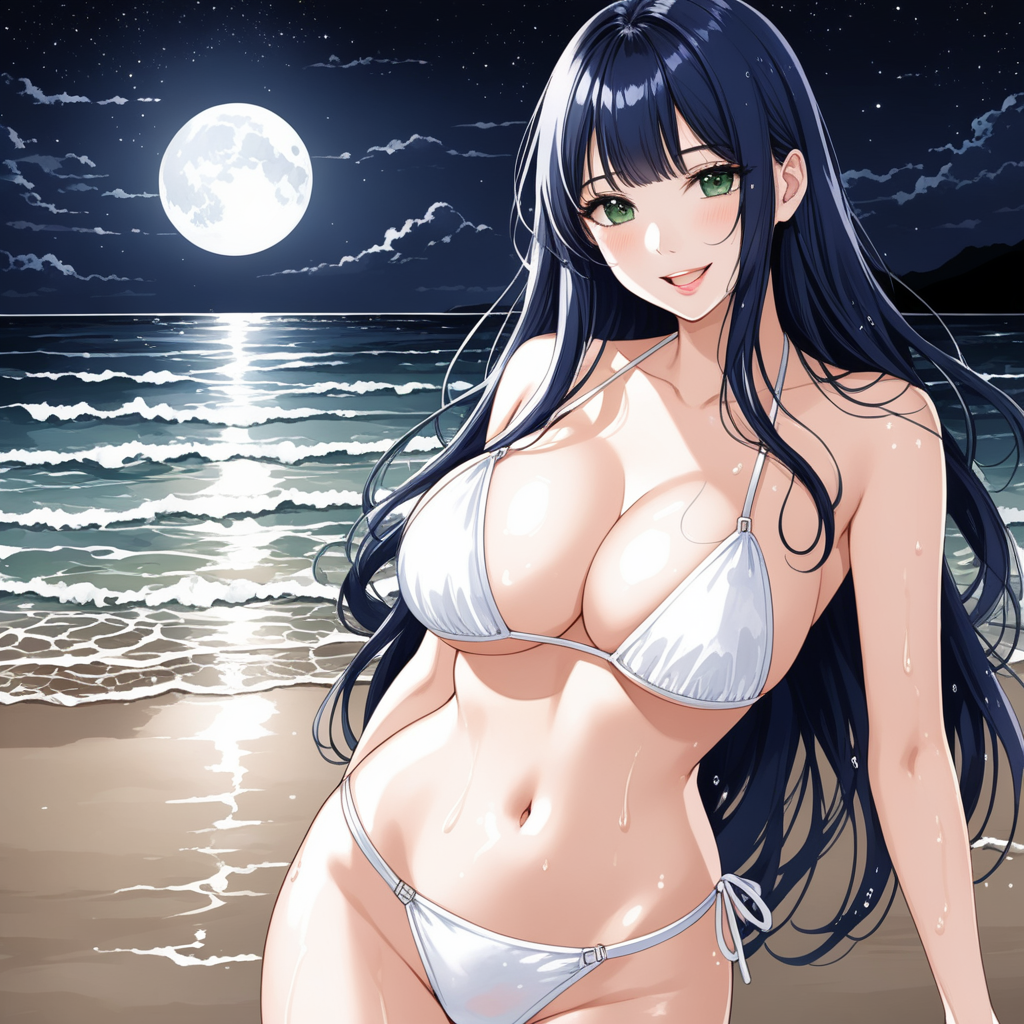 ultra-detailed, best quality, (anime drawing:1.2), (watercolor painting:0.91), detailed anatony, detailed face, detailed body, detailed shadow, detailed lip, detailed fingers, super-detailed white micro bikini, perfect body, perfect green eyes, perfect eyeliner, perfect eyelashes, aesthetic, beauty, beautiful, pretty, ㅅㅅy, cute, lovely, sweet, female, solo, dark blue hair, Parted to Side bangs, long hair, green eyes, mesmerizing eyes, (closed eyes:0.98), eyeliner, eyelashes, (blush:1.3), (open mouth:1.3), (smile:1.4), (seduced face:1.2), (huge breasts, huge tit, huge chest:1.6), Slender, slim body, belly, small waist, wide pelvis, (white micro bikini, mini bikini, tiny bikini:1.75), pale skin, lustrous skin, shiny skin, (wet:1.1), perspective, looking at viewer, full body, from front, nights, midnight, dark Beach, shore, sea, tide, full moon,