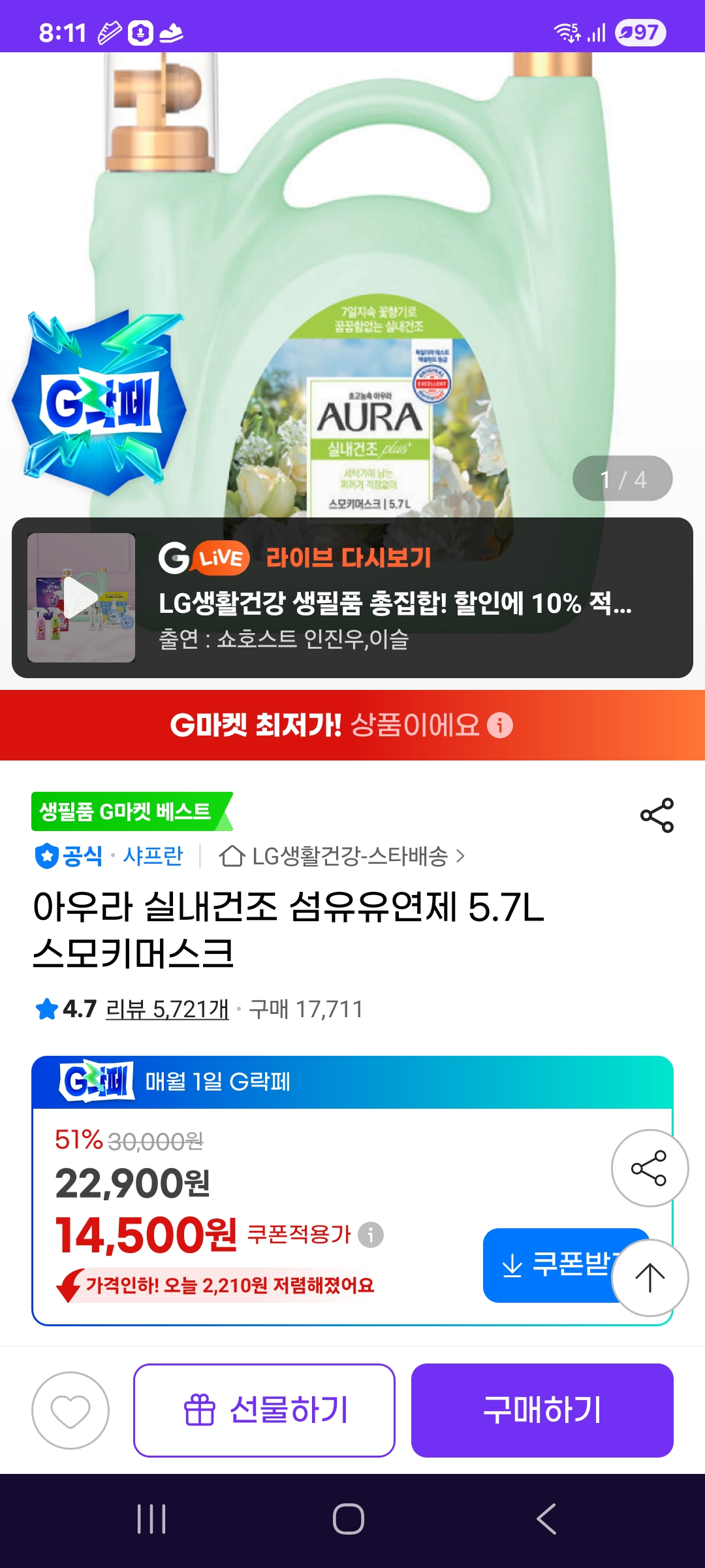 장바구니 들어가보니 전 15,400원으로 뜨고 신세계몰에서 파는 같은 상품 14,920원짜리가 더 싸다고 뜨네요.
