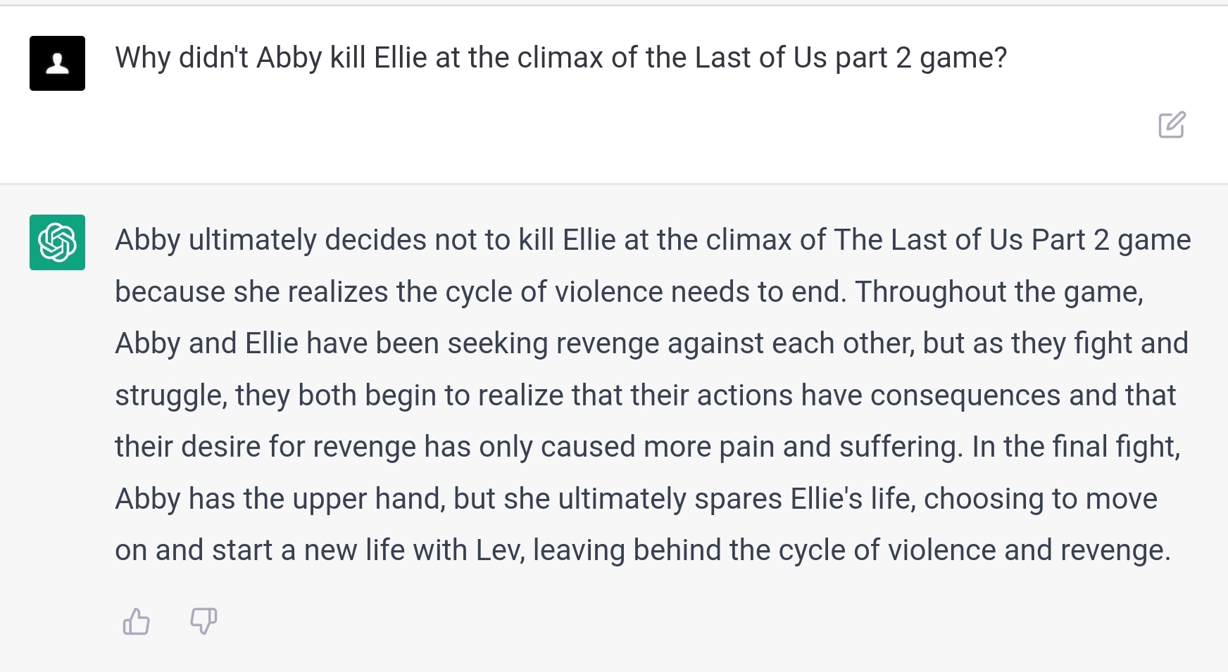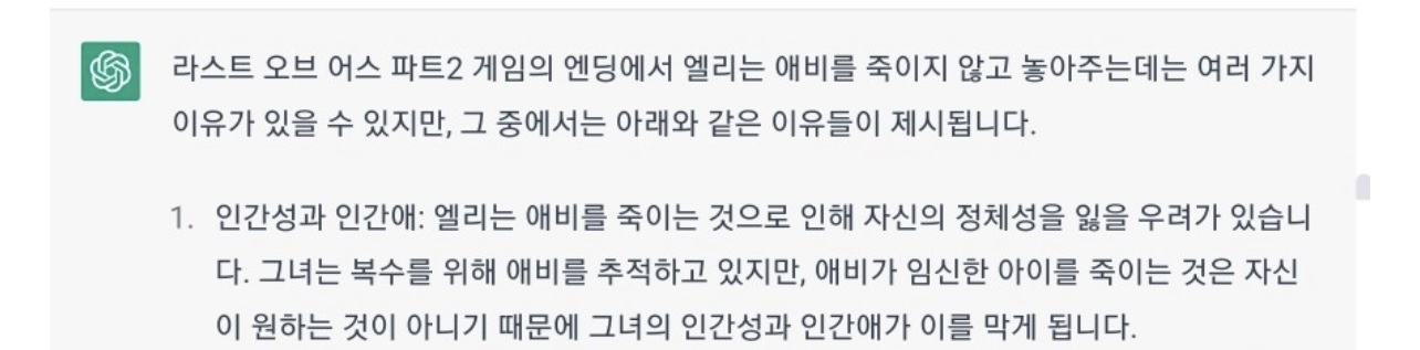 아이쿠 이렇게까지 해주시다니 감사합니다. 이부분에 대해서 문의한것이거든요, 애비가 임신했다는 판다은 가치판단이 아닌 사실을 적시한것인데요, 쳇지피티가 얘기했다면 근거가 있을것 같아서 한번 물어봤습니다.^^ 저도 겜하면서 애비가 임신했다는 근거는 못 봤고, 그런 게시글도 못 봤었거든요, 오언과 정사 한번 나온거 말고는 임신의 근거는 본적이 없는데요, AI이니 무슨 근거가 있지 않을까 싶었습니다. | 23.02.23 15:37 | |