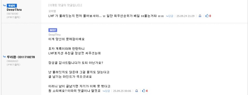 글쓴이의 그 동안 글들을 빠짐없이 보니 아주 태도가 젓같아서요 | 25.12.10 19:49 | |