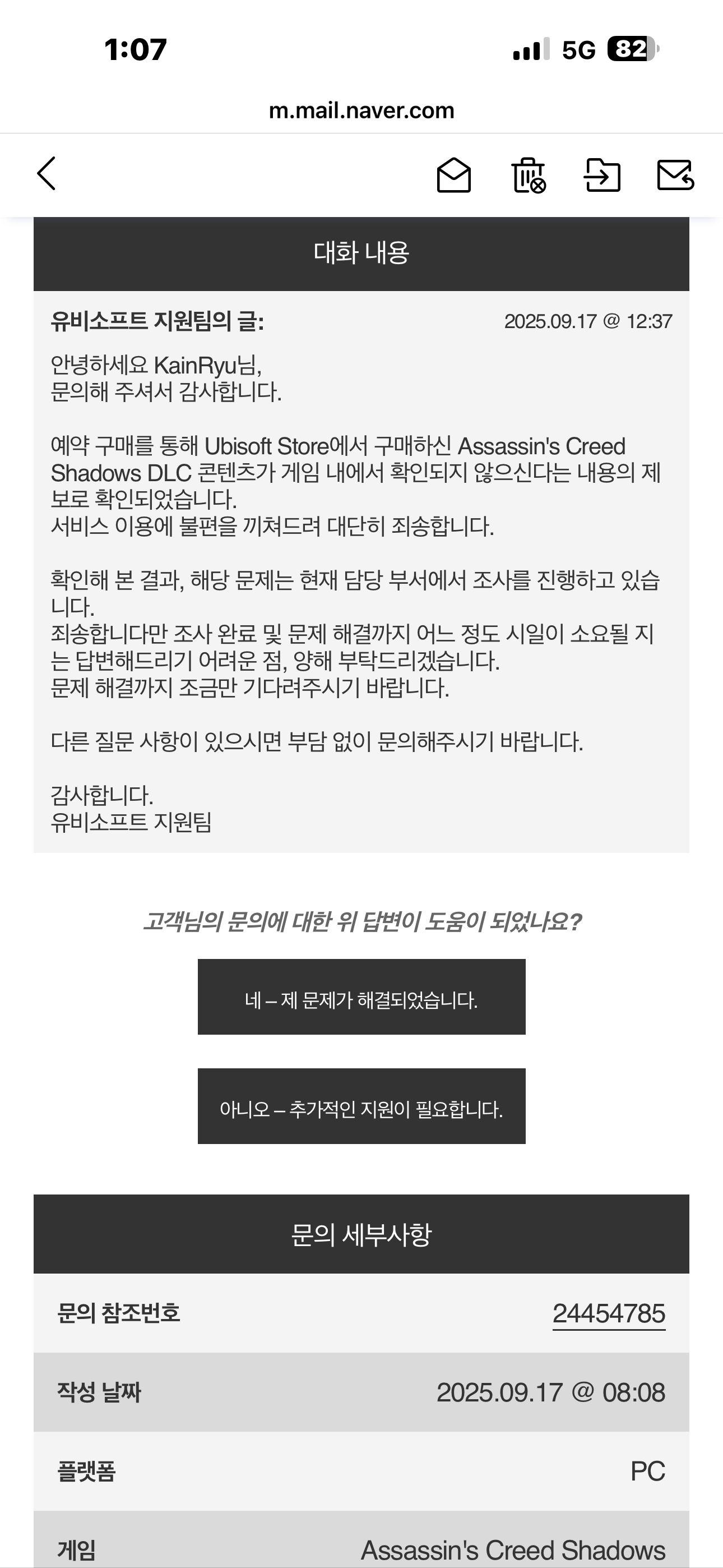 그 유비소프트 홈페이지 가서 문의 넣었슴돠 | 25.09.17 09:03 | | |