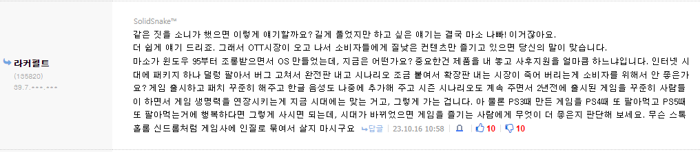 같은 짓을 소니가 했으면 이렇게 얘기할까요? 길게 풀었지만 하고 싶은 얘기는 결국 마소 나빠! 이거잖아요. 더 쉽게 얘기 드리죠. 그래서 OTT시장이 오고 나서 소비자들에게 질낮은 컨텐츠만 즐기고 있으면 당신의 말이 맞습니다. 마소가 윈도우 95부터 조롱받으면서 OS 만들었는데, 지금은 어떤가요? 중요한건 제품을 내 놓고 사후지원을 얼마큼 하느냐입니다. 인터넷 시대에 패키지 하나 덜렁 팔아서 버그 고쳐서 완전판 내고 시나리오 조금 붙여서 확장판 내는 시장이 죽어 버리는게 소비자를 위해서 안 좋은가요? 게임 출시하고 패치 꾸준히 해주고 한글 음성도 나중에 추가해 주고 시즌 시나리오도 계속 주면서 2년전에 출시된 게임을 꾸준히 사람들이 하면서 게임 생명력을 연장시키는게 지금 시대에는 맞는 거고, 그렇게 가는 겁니다. 아 물론 PS3때 만든 게임을 PS4때 또 팔아먹고 PS5때 또 팔아먹는거에 행복하다면 그렇게 사시면 되는데, 시대가 바뀌었으면 게임을 즐기는 사람에게 무엇이 더 좋은지 판단해 보세요. 무슨 스톡홀롬 신드롬처럼 게임사에 인질로 묶여서 살지 마시구요 | 23.10.16 10:58 | | |