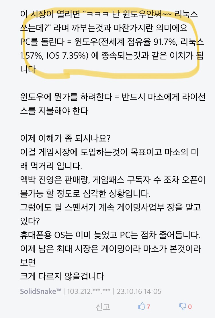 아직도 내가 하는 이야기를 완전히 오해하고 계신데... 마소는 엑박을 팔아서 수익을 남기려고 하는게 목적이 아닌 데이터스토리지를 장악하여 콘솔기기시장을 없애는게 목표라는 겁니다. 악독기업인지 대기업의 탐욕인지 따위가 내 이야기의 논제가 아니라 게임패스를 모든 플렛폼에 적용시켜버릴 경우 그 어떤 게임기도 마소에 종속되는 구조가 됨을 이야기 하는것입니다. 본문자체도 자사의 게이밍스트리밍(데이터스토리지)를 플스건 닌텐도건 휴대폰이건 PC건 할것없이 모두다 적용시키는 세상... 즉 마소의 서비스 생태계 안에 가두어 버리는 완벽한 1인독제 체제를 꿈꾸고 있는걸 꼬집는거에요.... 마소가 악덕기업인지 뭔지 따위는 내 관심 밖이고 이미 내가 이러한 댓글을 쓴것은 겜패 런칭할때부터 쓰던 댓글이거든요(타임라인으로 검색해 보세요) 기업은 이윤추구가 제1의 목적이고 돈이 되는곳이면 당연히 투자를 합니다. 동네 겜돌이 운운한 것은, 이러한 기업의 생태계를 일반 소비자들도 너무나도 쉽게 알 수 있고 PC사업이 저물어가는 현 시대에서 마소가 막강한 힘을 낼 수 있는 시장은 전세계 독점에 가까운 게임스토리지와 70%이상 먹고 있는 데이터스토리지(기업형)를 마소에 종속 시키는것 이라는 이야기입니다. 이 시장이 열리면 "ㅋㅋㅋ 난 윈도우안써~~ 리눅스 쓰는데?" 라며 까부는것과 마찬가지란 의미에요 PC를 돌린다 = 윈도우(전세계 점유율 91.7%, 리눅스 1.57%, IOS 7.35%) 에 종속되는것과 같은 이치가 됩니다 윈도우에 뭔가를 하려한다 = 반드시 마소에게 라이선스를 지불해야 한다 이제 이해가 좀 되시나요? 이걸 게임시장에 도입하는것이 목표이고 마소의 미래 먹거리 입니다. 엑박 진영은 판매량, 게임패스 구독자 수 조차 오픈이 불가능 할 정도로 심각한 상황입니다. 그럼에도 필 스펜서가 계속 게이밍사업부 장을 맡고 있다? 휴대폰용 OS는 이미 늦었고 PC는 점차 줄어듭니다. 이제 남은 최대 시장은 게이밍이라 마소가 본것이라 보면 크게 다르지 않을겁니다 | 23.10.16 14:05 | | |