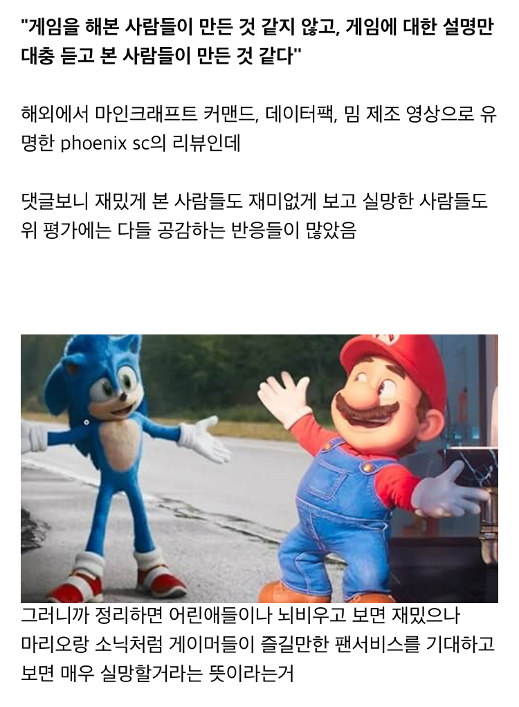 마리오 소닉과 달리 게임 원작 디테일을 완전히 무시해서 평론가들처럼 원작 팬들도 평이 별로입니다 10대 틱톡/숏츠 세대를 노려서 자극적으로만 만들었고 그게 흥해버렸습니다 | 25.04.07 13:06 | | |