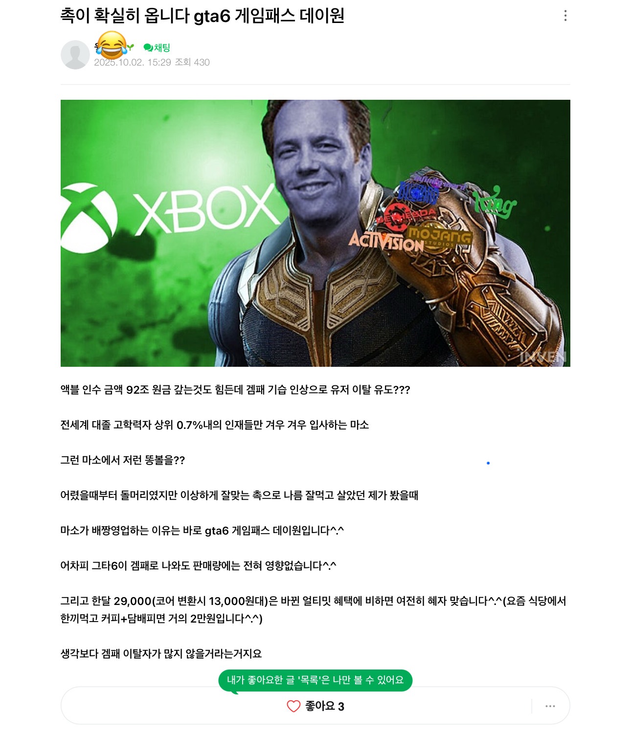 내생각엔 그냥 게임패스 사업 철수하려고 ..밑밥 까는 것 같은데.. | 25.10.02 19:52 | | |