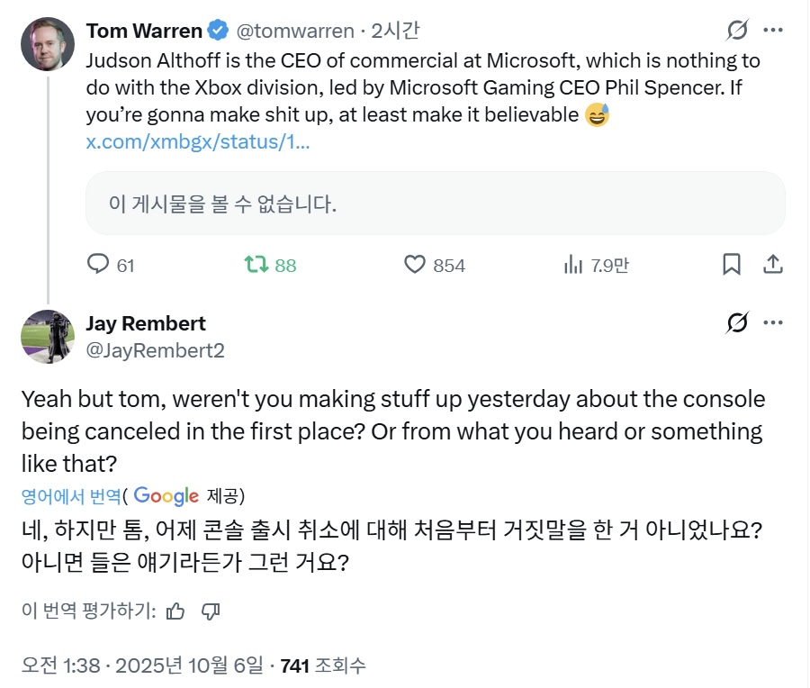 톰 워렌은 일단 자기는 차세대 XBOX가 취소된다고 말한적도 없고,그런 이야기도 들은적 없다고 한발 뒤로 물러남 | 25.10.06 10:27 | | |
