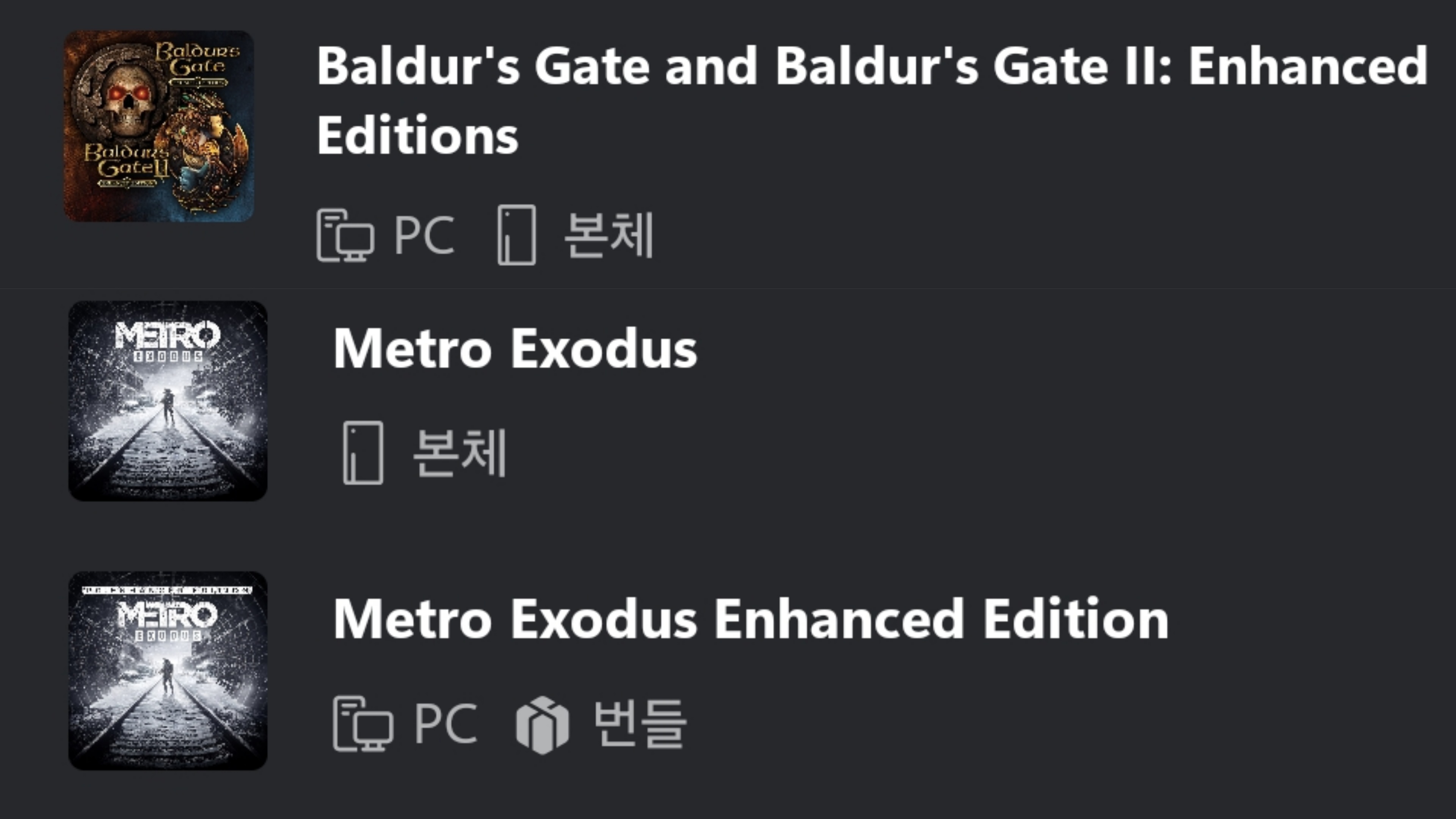 메트로 엑소더스는 플레이 가능에 피시랑 엑박 같이 표기 안 되어 있고 따로 팜. 발게1,2 합본은 플레이 가능에 엑박,pc 같이 있고 크로스 바이 지원하지만 크로스 세이브가 안 돼서 xpa 태그 없음. 사힐2는 아직 가등록이라 정식 등록돼야 알겠지만 지금 표기보면 크로스 바이는 지원이고 크로스 세이브는 미지원. | 25.11.08 15:18 | | |