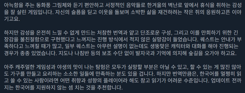 번역하기 귀찮으면 싸구려 번역 말고 게임사들이 deepl 을 기본으로 썼으면 좋겠음. 대부분 번역 저거 개발사 자체적으로 하는게 아니라 퍼블리셔가 제일 저렴한 곳에 외주 주거나 자기네 아무 직원 시키는건데 외주사나 개인이 최대한 싼거 혹은 구글 번역 같은 기계 번역으로 써서 구린 번역 결과물이 나오는 경우가 많음.