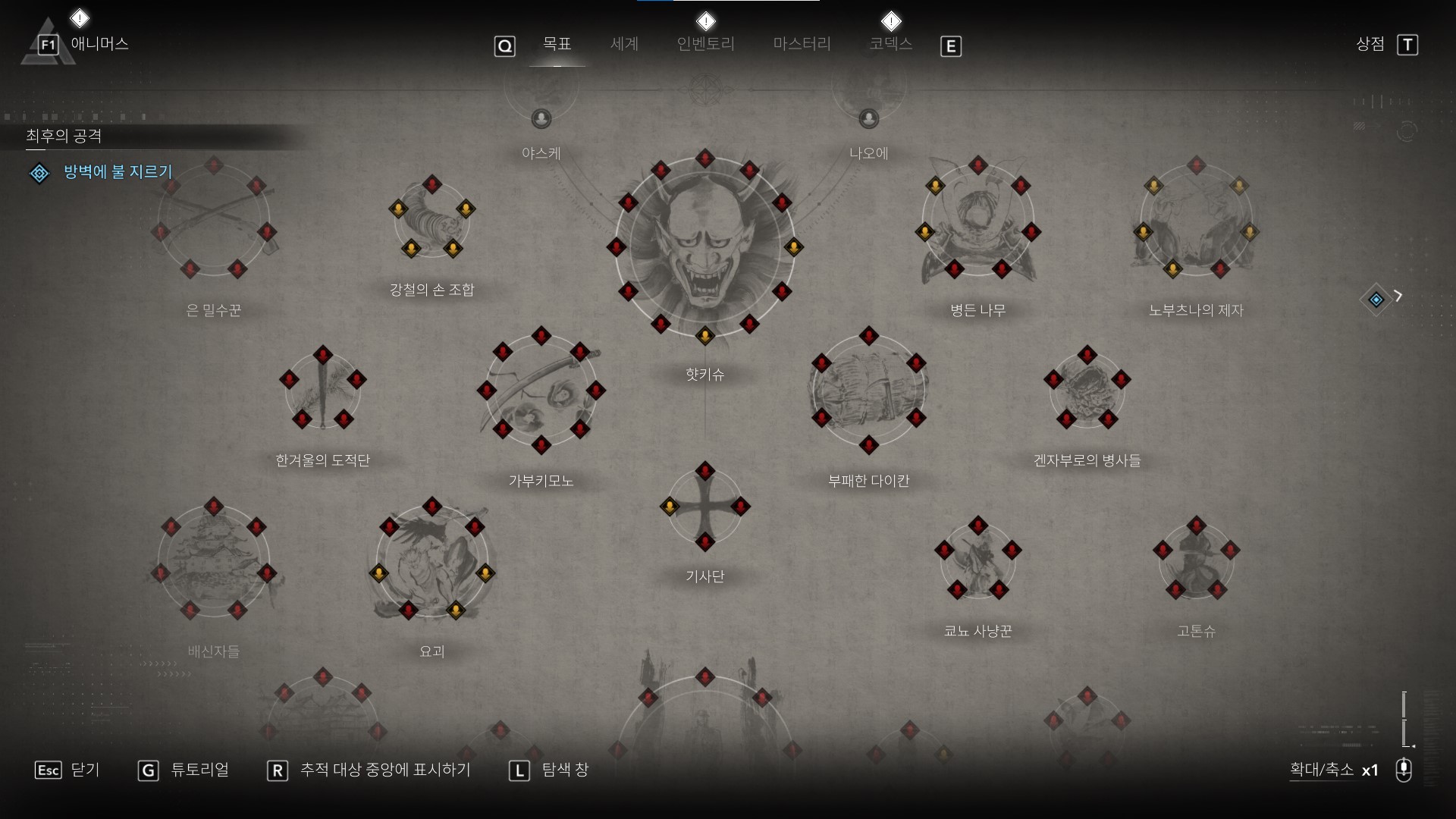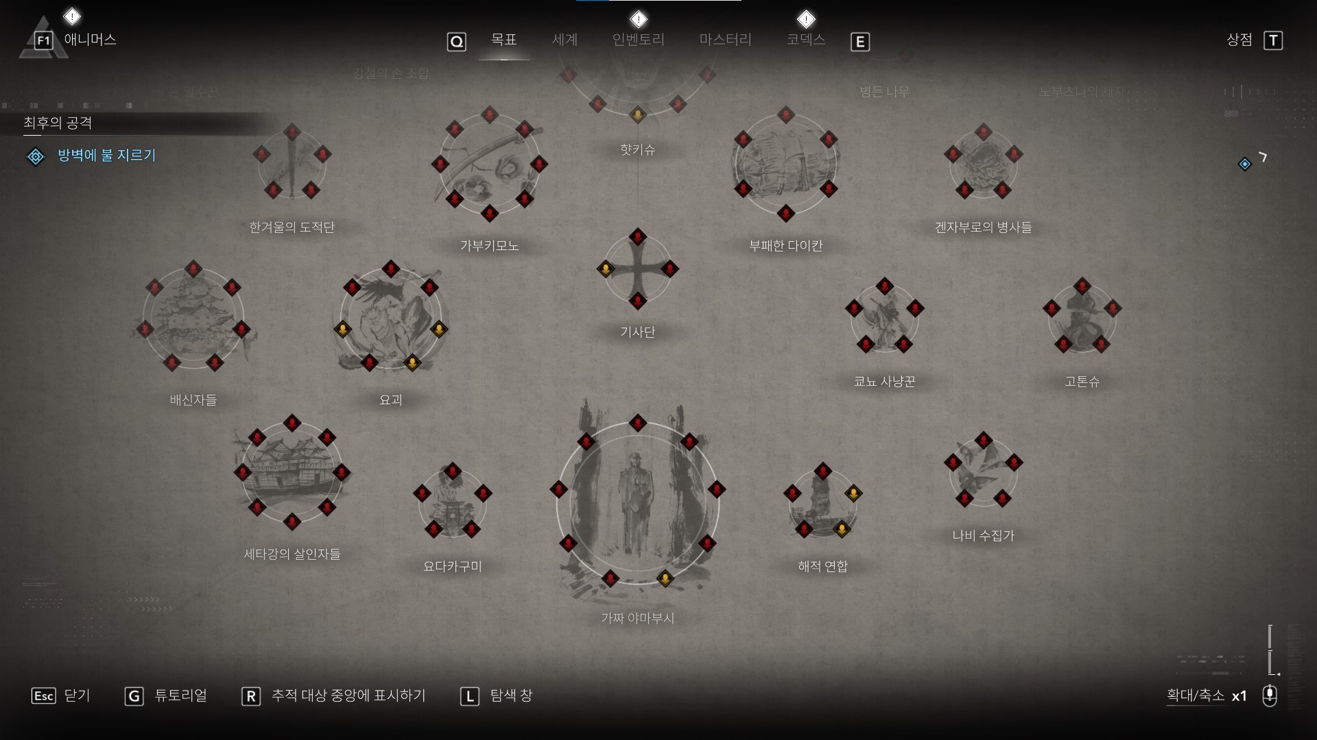 목표 화면에서 가부키모노, 나비 수집가, 세타강의 살인자들, 배신자들, 해적 연합 이런 식으로 “조직 하나씩 지워나가는 맛”이 꽤 중독적이더라고요.